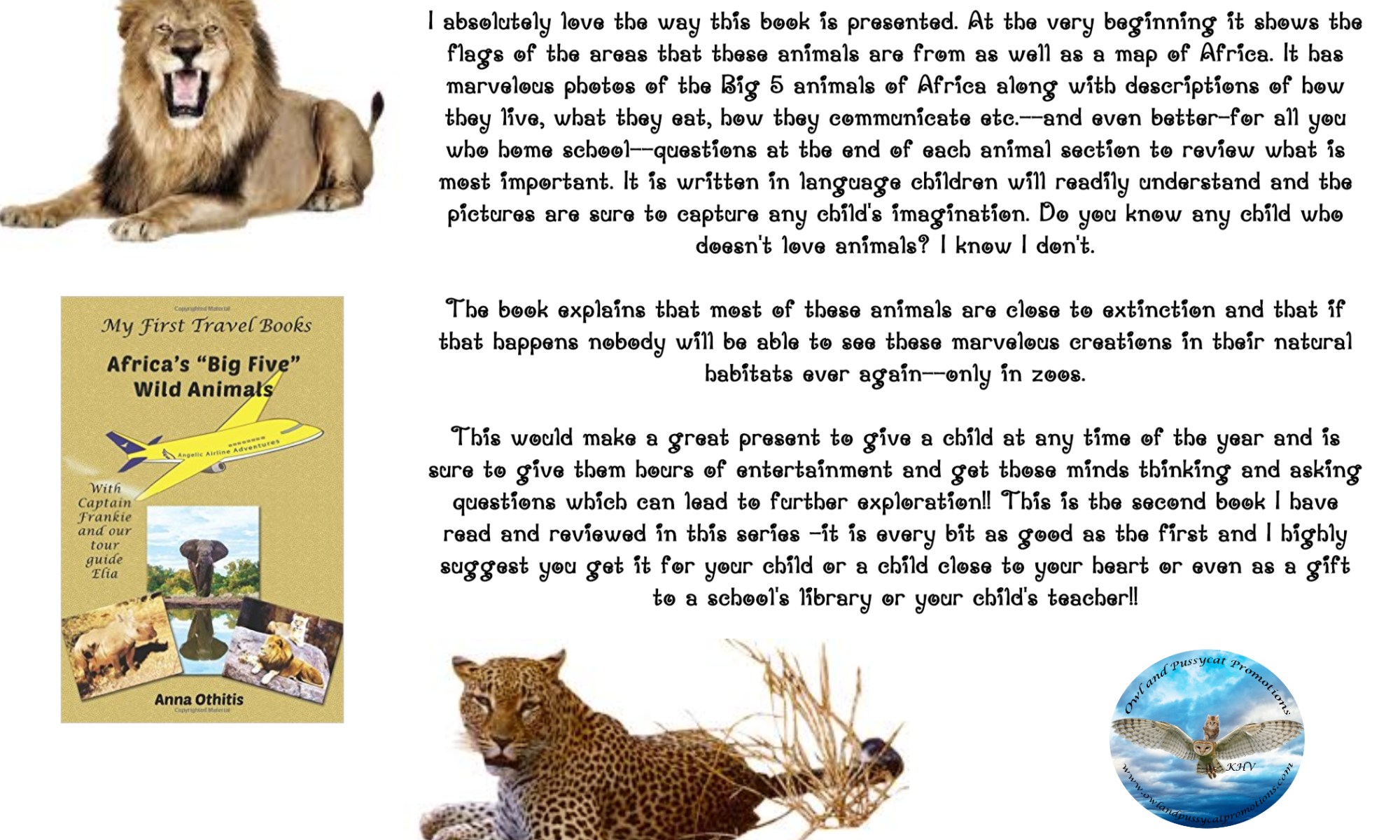 Posted on July 25, 2018 by The Owl LadyHEAR THE ELEPHANTS ROAR AND THE ELEPHANTS TRUMPET –AFRICAS BIG FIVE WILD ANIMALS!!!! ANNA OTHITIS karenwritesmurder A RAVE REVIEW FOR AFRICA’S BIG FIVE WILD ANIMALS MEET THE AFRICAN BUFFALO AMAZON BARNES & NOBLE BOOKS-A-MILLION View original postPlease share: Share on Facebook (Opens in new window) Facebook Share on LinkedIn (Opens in new window) LinkedIn Share on Pinterest (Opens in new window) Pinterest Share on Pocket (Opens in new window) Pocket Share on Tumblr (Opens in new window) Tumblr Share on X (Opens in new window) X More Email a link to a friend (Opens in new window) Email Print (Opens in new window) Print Share on Reddit (Opens in new window) Reddit Share on Flipboard (Opens in new window) Flipboard Share on Telegram (Opens in new window) Telegram Share on WhatsApp (Opens in new window) WhatsApp Like Loading... Related