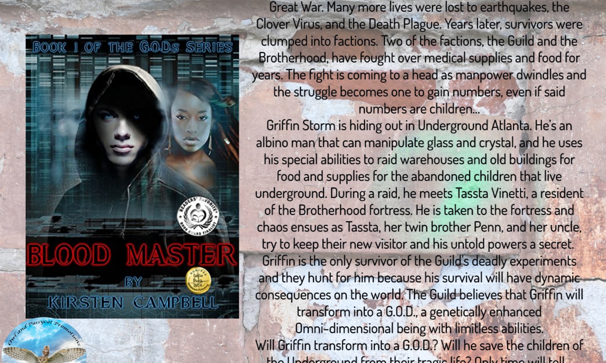 Griffin Storm is hiding out in Underground Atlanta. He’s an albino man that can manipulate glass and crystal, and he uses his special abilities to raid warehouses and old buildings for food and supplies for the abandoned children that live underground. During a raid, he meets Tassta Vinetti, a resident of the Brotherhood fortress. He is taken to the fortress and chaos ensues as Tassta, her twin brother Penn, and her uncle, try to keep their new visitor and his untold powers a secret.