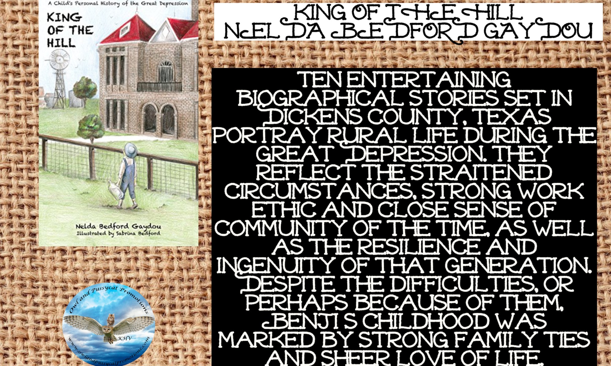 Posted on August 27, 2018 by The Owl LadySTORIES OF BENJI A YOUNG BOY LIVING IN DEPRESSION ERA TEXAS! KING OF THE HILL –NELDA B. GAYDOU karenwritesmurder King of the Hill Kindle Edition King of the Hill Paperback – May 10, 2018 View original postPlease share: Share on Facebook (Opens in new window) Facebook Share on LinkedIn (Opens in new window) LinkedIn Share on Pinterest (Opens in new window) Pinterest Share on Pocket (Opens in new window) Pocket Share on Tumblr (Opens in new window) Tumblr Share on X (Opens in new window) X More Email a link to a friend (Opens in new window) Email Print (Opens in new window) Print Share on Reddit (Opens in new window) Reddit Share on Flipboard (Opens in new window) Flipboard Share on Telegram (Opens in new window) Telegram Share on WhatsApp (Opens in new window) WhatsApp Like Loading... Related
