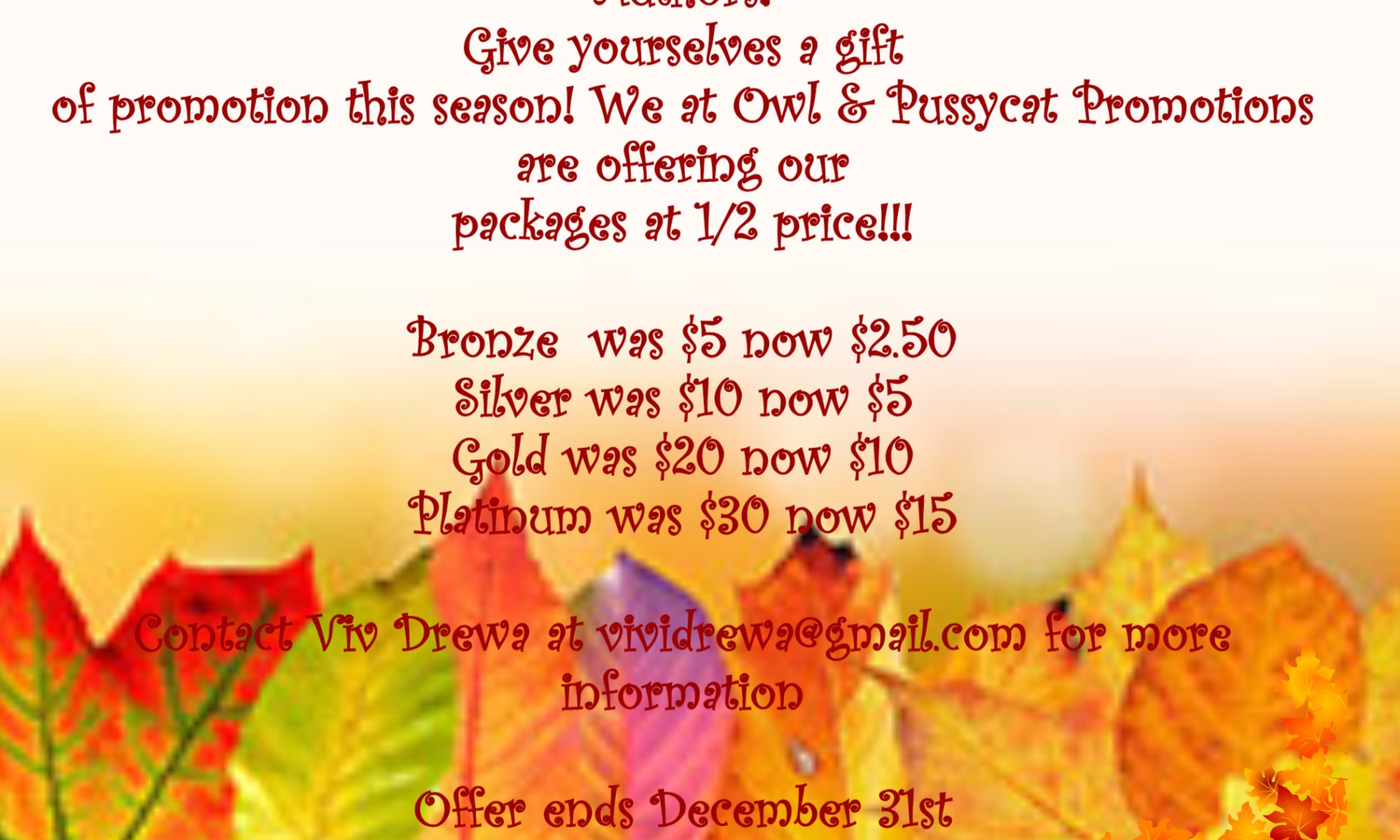 WE HAVE CUT OUR PRICES IN HALF FOR THE FALL AND CHRISTMAS. GIVE YOURSELF A TREAT THIS HALLOWEEN OR A GIFT FOR CHRISTMAS!